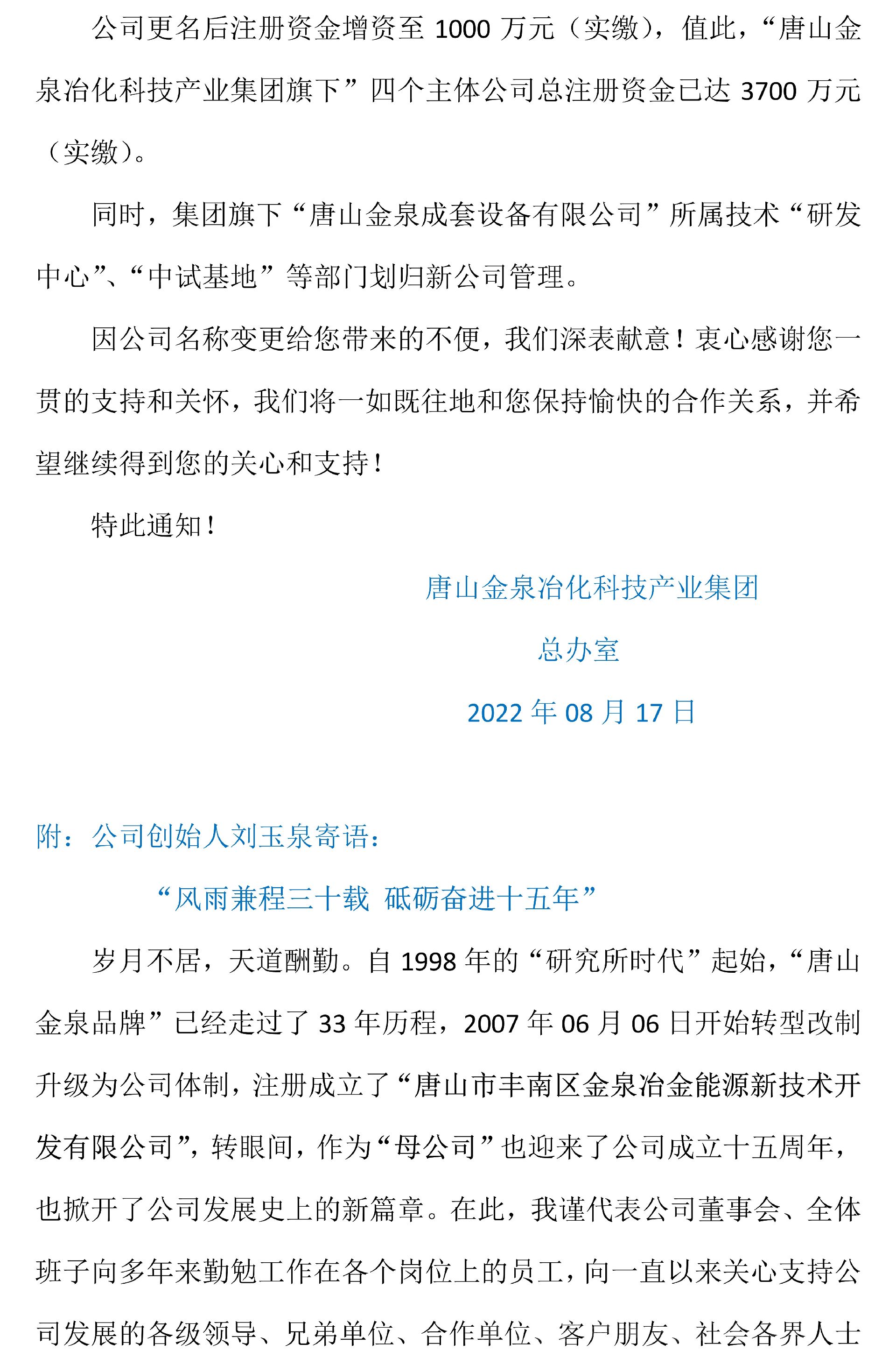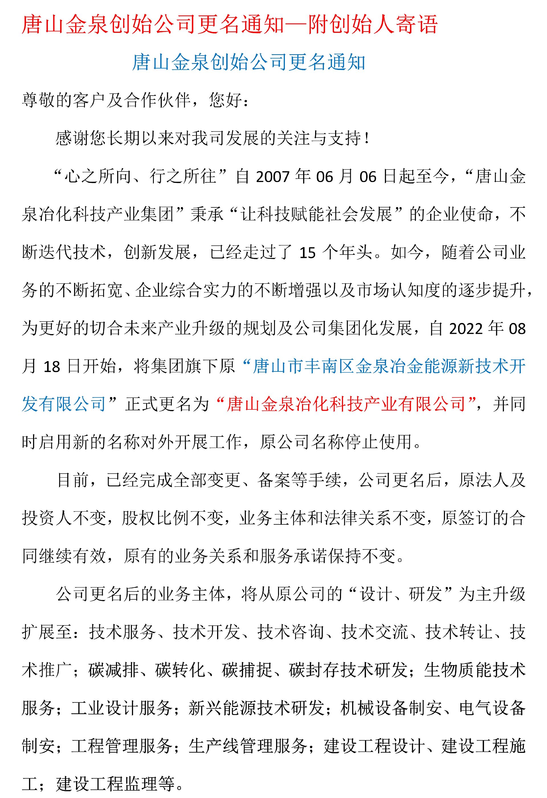 唐山金泉創(chuàng)始公司更名通知—附創(chuàng)始人寄語