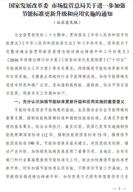 附件:國家發(fā)展改革委 市場監(jiān)管總局關于進一步加強節(jié)能標準更新升級和應用實施的通知(征求意見稿)
