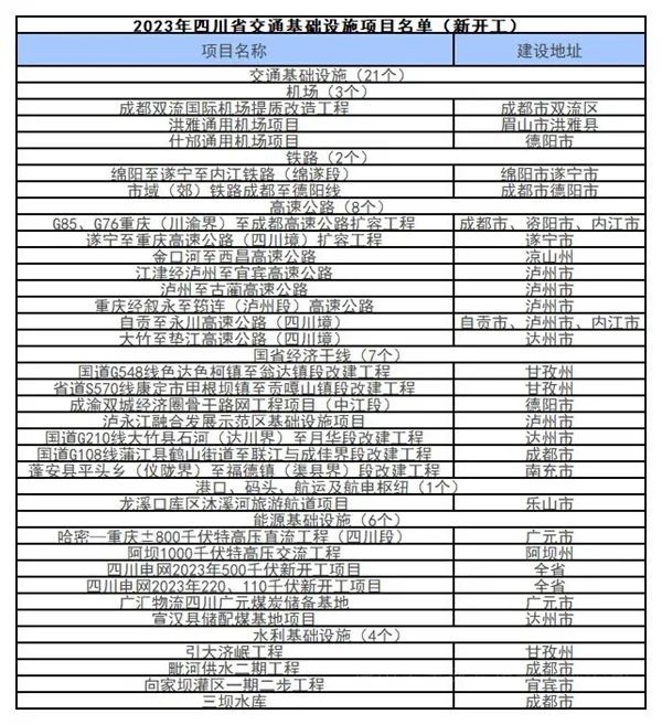 四川省:2023年四川省重點(diǎn)項(xiàng)目名單共列700個項(xiàng)目,其中續(xù)建項(xiàng)目464個,新開工項(xiàng)目236個。新開工項(xiàng)目中,基礎(chǔ)設(shè)施項(xiàng)目有86個,其中交通基礎(chǔ)設(shè)施21個,包括機(jī)場項(xiàng)目3個、鐵路項(xiàng)目2個、高速公路項(xiàng)目8個、國省經(jīng)濟(jì)干線項(xiàng)目7個、港口、碼頭、航運(yùn)及航電樞紐項(xiàng)目1個。