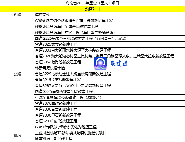 海南�。� 海南省2023年安排了98個預(yù)備項(xiàng)目,其中鐵路、公路、機(jī)場項(xiàng)目有: