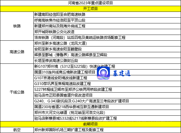 河南�。� 2023年河南省共安排省重點(diǎn)建設(shè)項(xiàng)目2505個,其中基礎(chǔ)設(shè)施建設(shè)項(xiàng)目392個,開工、前期鐵路、公路等交通類項(xiàng)目有:
