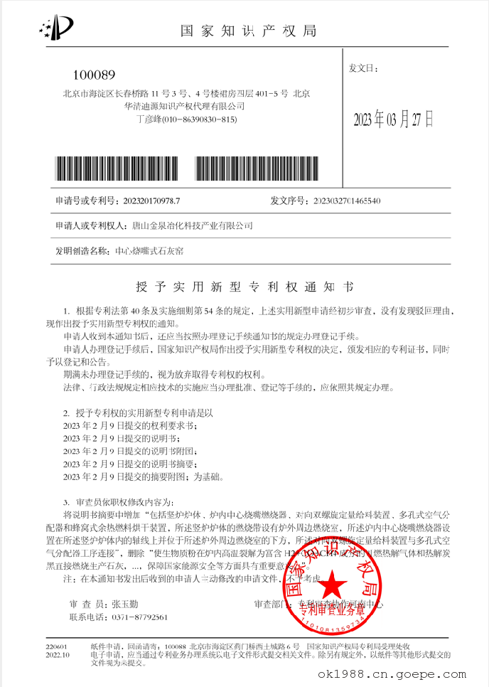 2023年03月27日,唐山金泉冶化科技產(chǎn)業(yè)有限公司榮獲中華人民共和國(guó)國(guó)家知識(shí)產(chǎn)權(quán)局頒發(fā)的“中心燒嘴式石灰窯(專利號(hào):202320170978.7)”專利證書(shū),本證自發(fā)行之日起生效,無(wú)論其“實(shí)用新型專利”及同步實(shí)施的“發(fā)明專利”均受到國(guó)家自主知識(shí)產(chǎn)權(quán)保護(hù)。
