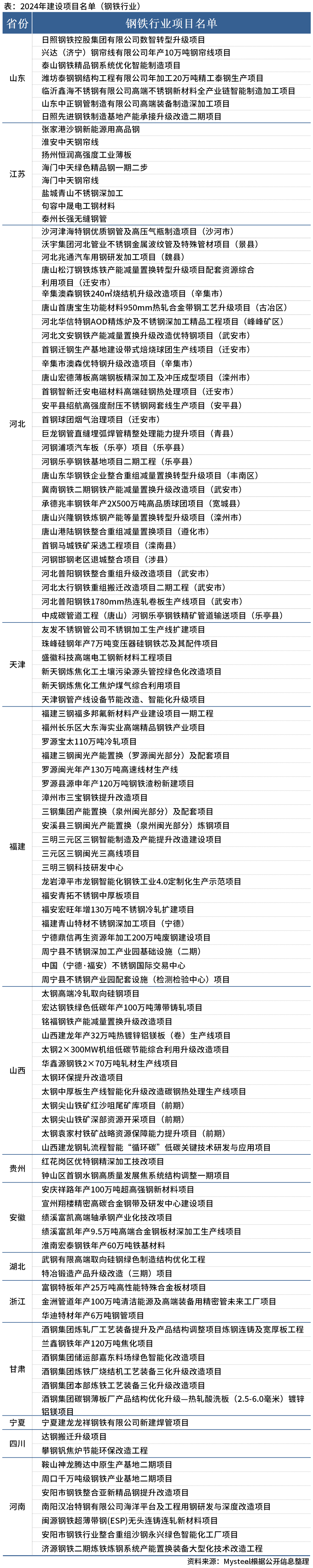 據(jù)不完全統(tǒng)計(jì),截至2024年3月19日,江蘇、山東、河南、河北、山西、天津、安徽、福建、湖北、寧夏、貴州、甘肅、浙江、四川等地發(fā)布2024年建設(shè)項(xiàng)目名單,其中,涉及鋼鐵行業(yè)相關(guān)項(xiàng)目109個(gè)。具體內(nèi)容如下: