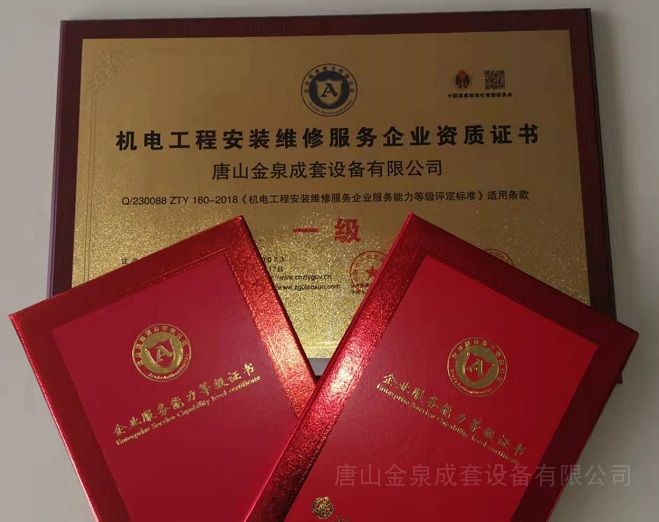 2022年02月18日,唐山金泉冶化科技產(chǎn)業(yè)集團(tuán)旗下唐山金泉成套設(shè)備有限公司成功升級《機(jī)電工程安裝維修服務(wù)企業(yè)一級資質(zhì)》。
