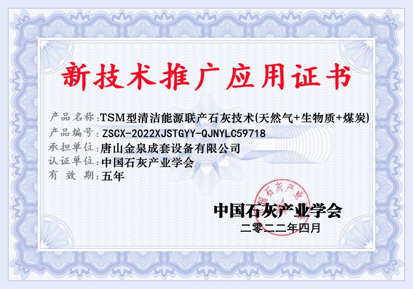 會議中,經(jīng)與會專家組成員一致通過,對唐山金泉公司的“TSM型清潔能源聯(lián)產(chǎn)石灰系列技術(shù)”之“雙膛豎窯噴吹生物質(zhì)粉低耗降碳生產(chǎn)石灰技術(shù)”和“天然氣與生物質(zhì)燃料聯(lián)產(chǎn)石灰工藝及裝備”兩項擁有自主知識產(chǎn)權(quán)的專利技術(shù)頒發(fā)了“新技術(shù)新裝備行業(yè)推廣證書”。