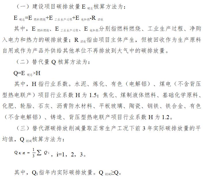 核算替代量時(shí),替代量為建設(shè)項(xiàng)目碳排放量乘以行業(yè)系數(shù)。水泥行業(yè)系數(shù)為1.5,也就是說,水泥企業(yè)擬建項(xiàng)目新增多少碳排放量,就要通過替代源減少1.5倍的碳排放量。具體核算方法如下: