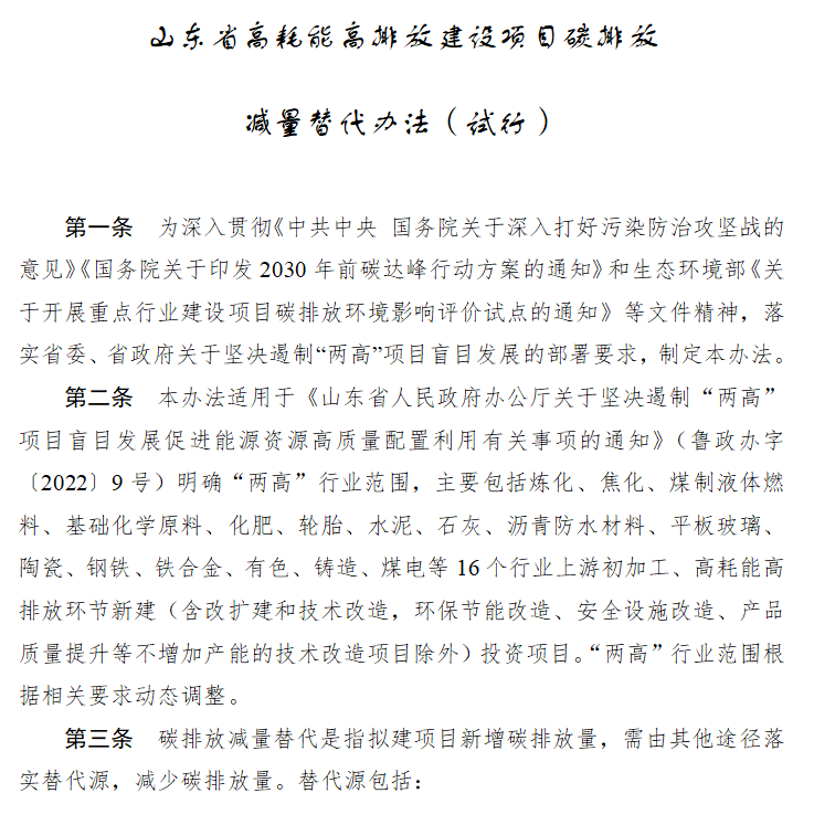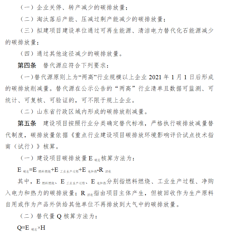 山東省明確要求嚴(yán)格落實(shí)產(chǎn)能、煤耗、能耗、碳排放、污染物排放等“五個減量替代”,其中,產(chǎn)能、煤耗、能耗、污染物排放等管理辦法相對成熟,此次《替代辦法》的出臺,填補(bǔ)了沒有碳排放減量替代的政策空白,使“五個減量替代”的政策拼圖更為完整。將碳排放控制從末端移到前端,在“兩高”項(xiàng)目建設(shè)的環(huán)評入口就明確了減量替代的比例,并落實(shí)削減量替代來源,推動生態(tài)環(huán)境保護(hù)治理體系治理能力現(xiàn)代化。