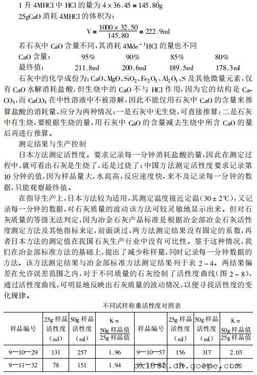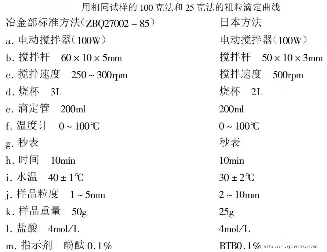 分別用冶金部標(biāo)準(zhǔn)方法和日本方法對同一樣品(鹽燒生石灰)進(jìn)行測定。