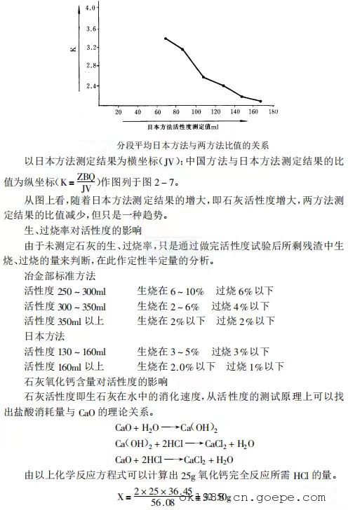 結(jié)論冶金部標(biāo)準(zhǔn)方法(ZBQ27002-85)和日本方法的測定結(jié)果之間,沒有固定的系數(shù),它們的測定結(jié)果不能互相推算。生、過燒率直接影響生石灰的活性度,在原料、燃料條件一定的情況下,生產(chǎn)操作必須嚴(yán)格控制石灰的生燒和過燒,以提高石灰活性度。生石灰CaO含量的高低主要取決于原料青石的CaO含量,要生產(chǎn)高質(zhì)量的石灰,須選用高品位的青石,因為品位低的青石中有較高含量的雜質(zhì)元素(如Fe2O3、Al2O3、SiO2等 ),在煅燒過程中,與CaO生成難溶解的化合物,從而降低生石灰的活性度�;钚远葴y定方法以冶金部標(biāo)準(zhǔn)方法為基礎(chǔ),稱量25g 樣品,記錄每一分鐘的數(shù)據(jù),結(jié)果乘 2 的方法較為適宜,它不僅能測出活性度的準(zhǔn)確值,而且可根據(jù)石灰水解反應(yīng)過程,來判斷爐況和指導(dǎo)調(diào)整爐況。