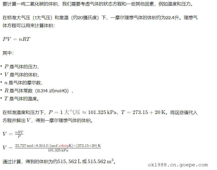 因此,一噸二氧化碳在標(biāo)準(zhǔn)溫度和壓力下的體積約為515.562m³。請注意,這個計算基于理想氣體行為,實(shí)際條件下可能有所不同。