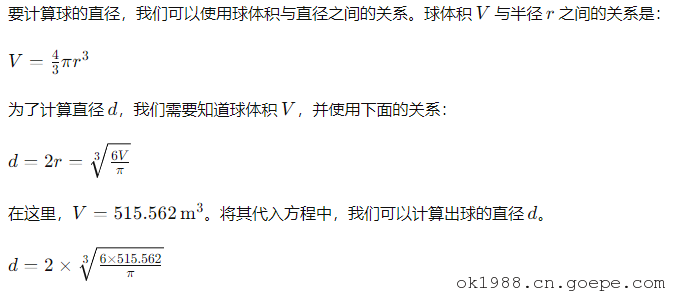通過計算,我們得到球的直徑約為9.09米。因此,具有 515.562m³體積的球的直徑約為9.09米。