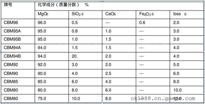 我國輕燒氧化鎂粉標準(YB/T5206—2004),燒結(jié)鎂砂 (GB/T2273—2007)和電熔砂 (YB/T5266 —2004)都是針對采用菱鎂礦石加工而制定的,輕燒氧化鎂產(chǎn)品理化指標見表1。