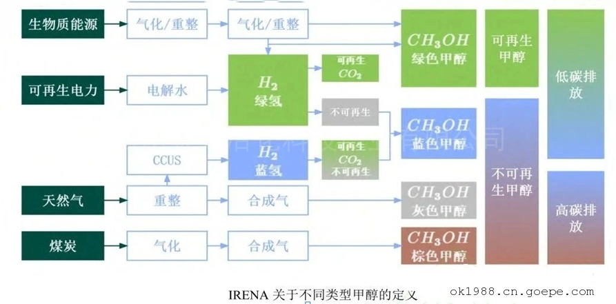 甲醇分為綠色、藍(lán)色、灰色和棕色,即當(dāng)H2和CO2來源均為綠色或可再生能源時(shí),生產(chǎn)的甲醇屬于綠色甲醇。一般而言,綠色甲醇通常指用綠氫(綠電電解水制氫)和可再生CO2(如來自生物質(zhì)重整、空氣捕集等)合成的甲醇。在本文中,綠色甲醇即指用可再生能源制取的H2和CO2(來自生物質(zhì)、空氣捕集、煙氣捕集等均可)合成的甲醇。