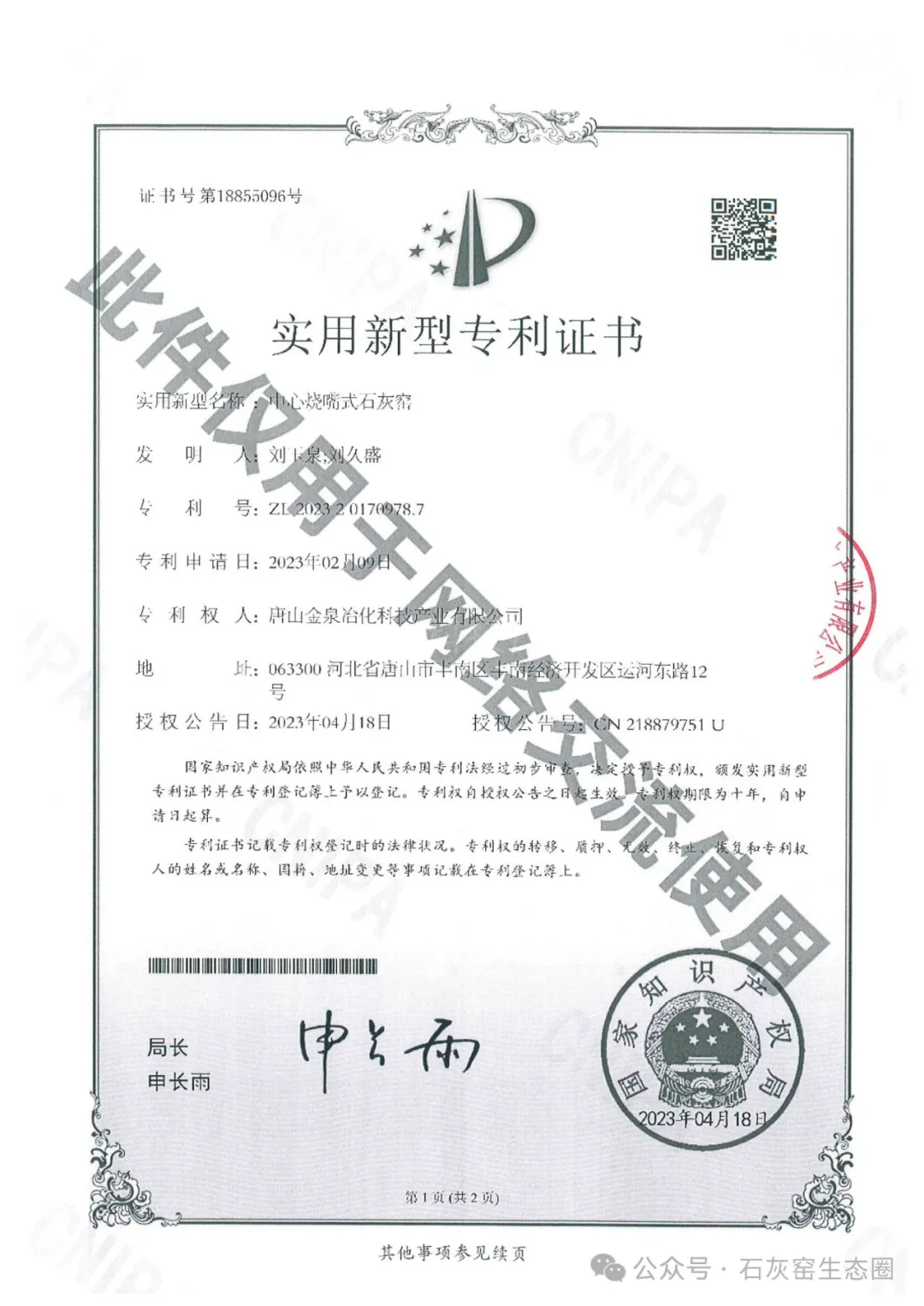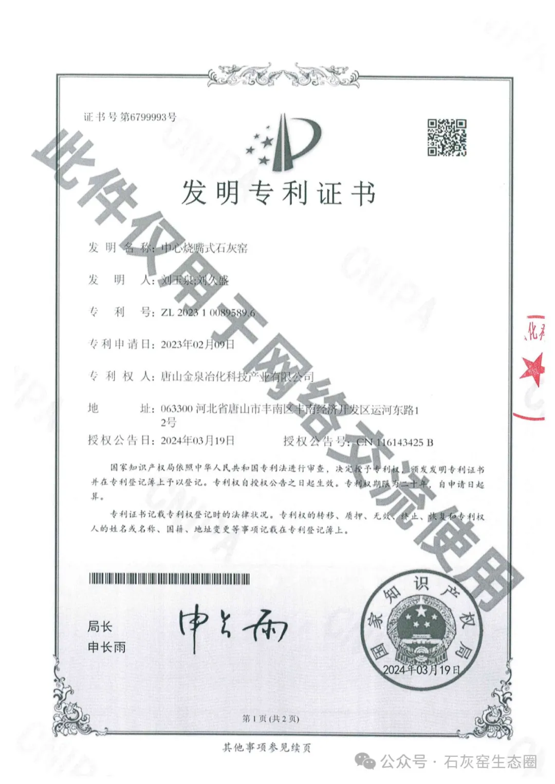 唐山金泉公司自成立以來,始終致力于通過持續(xù)技術(shù)創(chuàng)新推動(dòng)行業(yè)發(fā)展,為行業(yè)用戶提供環(huán)保、節(jié)能、高效、可靠的石灰生產(chǎn)技術(shù)和服務(wù)�!吨行臒焓绞腋G》已獲得包括發(fā)明、實(shí)用新型等多項(xiàng)國內(nèi)專利認(rèn)證,并獲得了廣泛的認(rèn)可和客戶的歡迎,無論其發(fā)明的“名稱、內(nèi)容”均在保護(hù)范圍之內(nèi)。(附:專利證書)