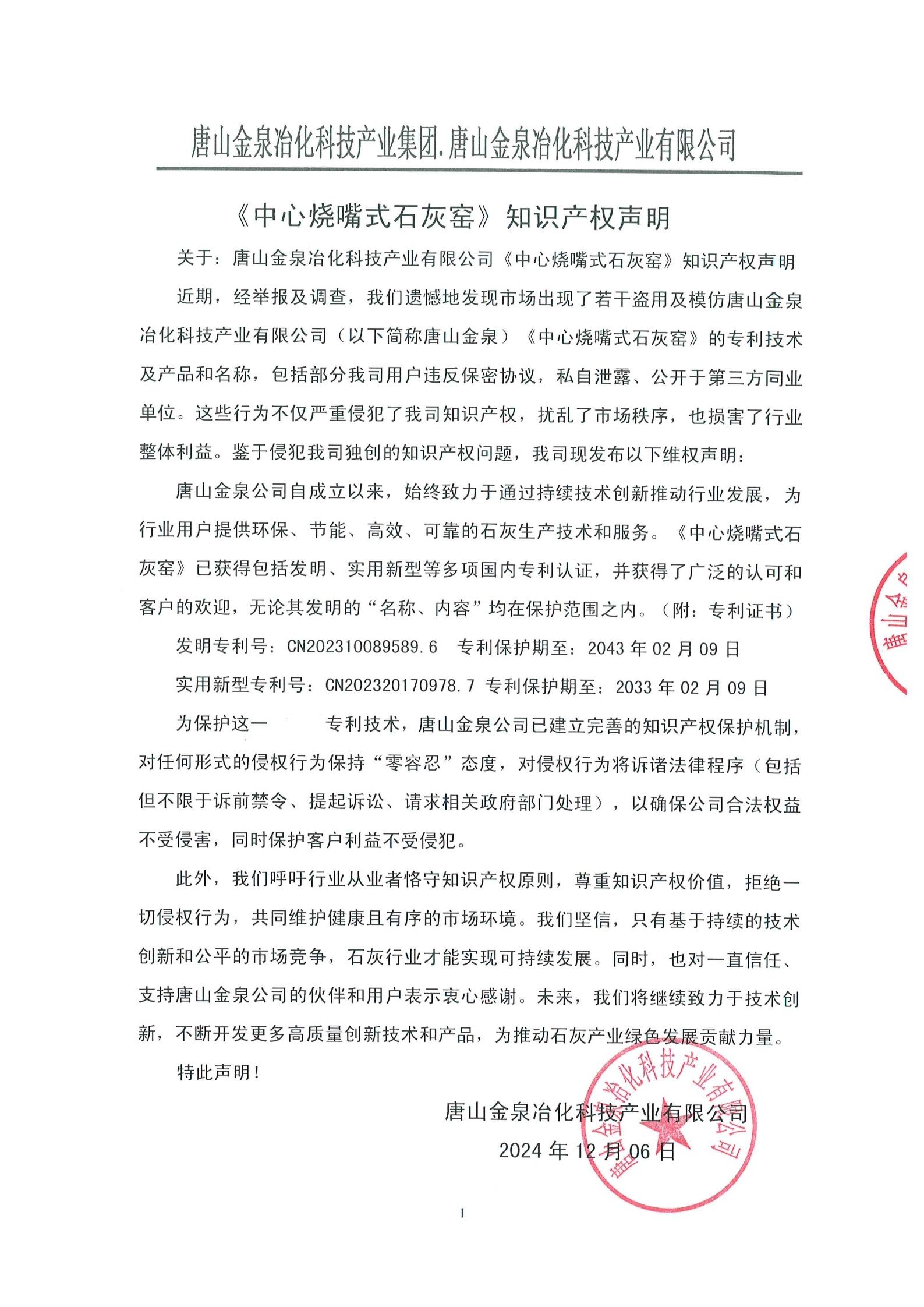 關(guān)于:唐山金泉冶化科技產(chǎn)業(yè)有限公司《中心燒嘴式石灰窯》知識(shí)產(chǎn)權(quán)聲明