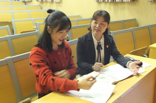 郴州市六中黨委書記羅柳莉(右)指導(dǎo)青年教師思政課備課