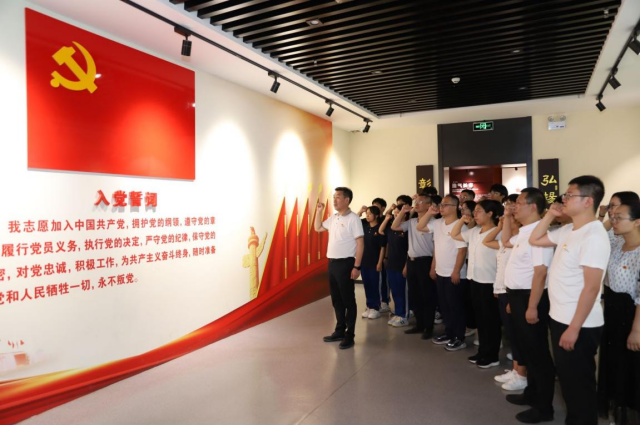 在紀念館大廳內,全體黨員面向黨旗,莊重地重溫了入黨誓詞。