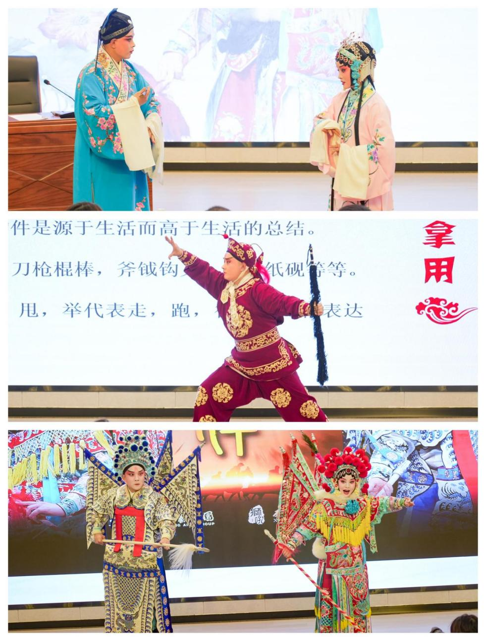 活動期間,舞臺上生動的互動體驗,讓大家更直觀地領略到傳統文化的深厚底蘊和戲服下流淌的千年文脈。舞臺上,多名演員以“生、旦、凈、丑”四大行當為脈絡,現場演繹并傳授“撲蝶”“喂雞”“穿針引線”等經典戲曲動作,并邀請學生模仿,演員老師細致拆解動作要領與內涵,深入淺出地闡釋戲曲藝術中“以虛寫實、以形傳神”的美學精髓。學生們全神貫注、踴躍參與,在互動環節中爭相效仿。
