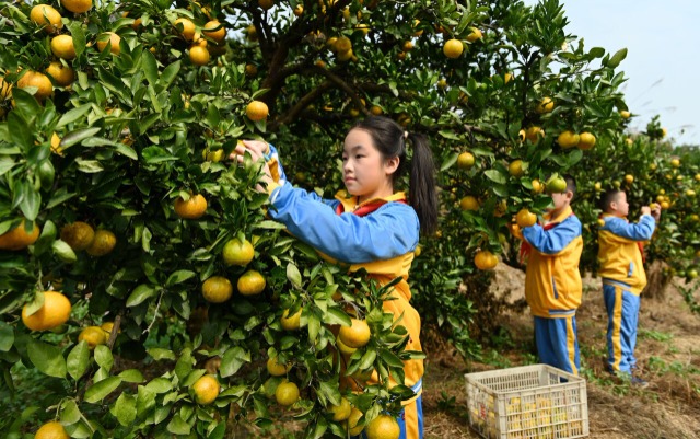 10月30日,湖南省邵陽市洞口縣文昌街道第一小學組織學生到附近柑橘園采摘柑橘,體驗勞動的樂趣與艱辛,引導學生從小熱愛勞動,樹立勞動光榮的美德。中國教育報-中國教育新聞網(wǎng)通訊員 滕治中 攝