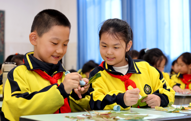 深秋時節,山東省棗莊市市中區東湖小學開展“小手巧作樹葉畫”活動,學生們巧妙利用各種造型的落葉,通過用剪、拼、粘等方法制作成“樹葉畫”,留住多彩秋天,表達對大自然的熱愛。中國教育報-中國教育新聞網通訊員 孫中喆 楊列元 攝