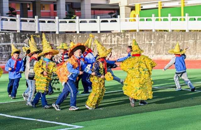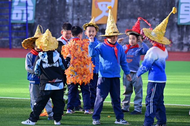 11月21日,湖北省十堰市竹山縣恒升小學“快樂成長工程”暨第八屆體育文化節開幕式上,學生身著用銀杏葉、楓葉、金菊等材料制作的服飾集體亮相,驚艷校園。中國教育報-中國教育新聞網通訊員 石濡華 郭瑩瑩 攝
