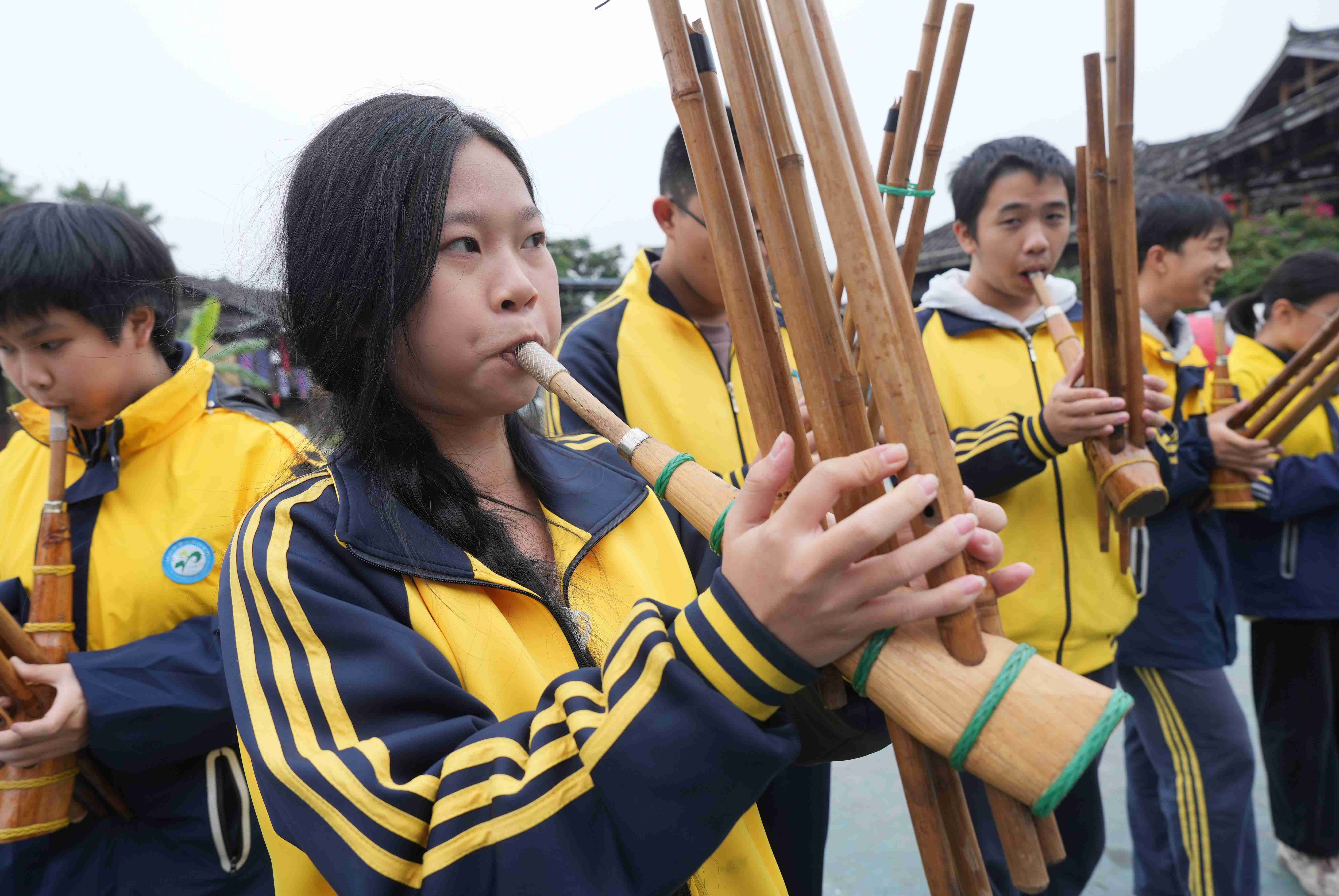 在廣西柳州市融水苗族自治縣夢嗚苗寨,孩子們體驗吹奏蘆笙。通訊員 龍濤 攝