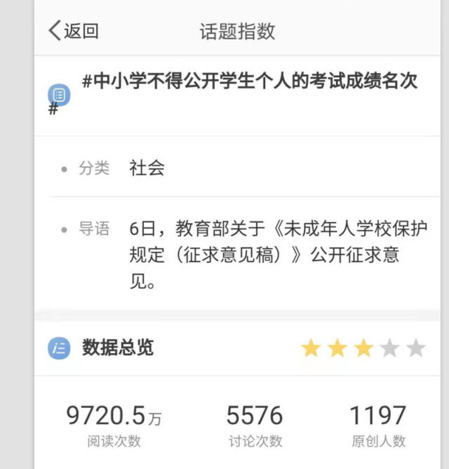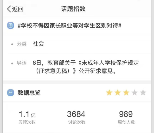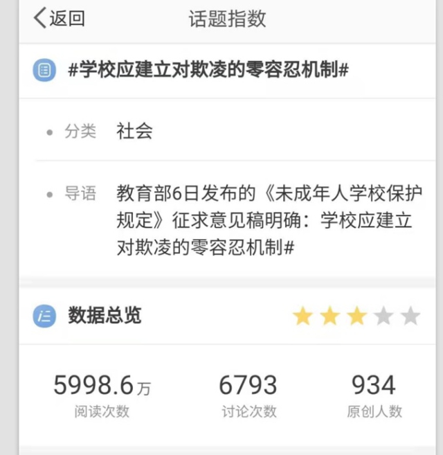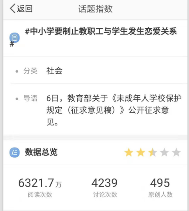 #未成年人學校保護規定##學校不得因家長職業等對學生區別對待##中小學要制止教職工與學生發生戀愛關系##教育部擬規定中小學禁止師生戀##學校不得公開學生成績和排名##學校應建立對欺凌零容忍機制#等數條內容沖上熱搜。截至7日上午11點,以上話題的新浪微博總閱讀量超過3億。