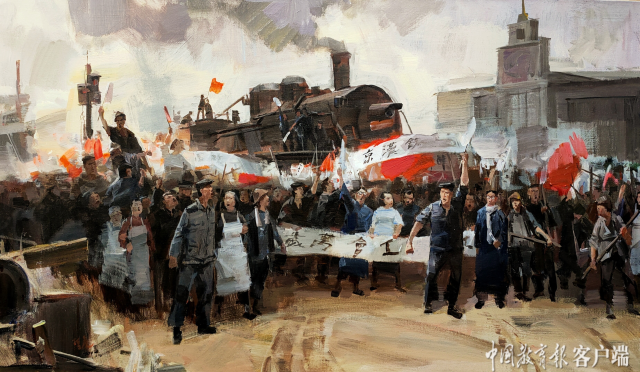 上應(yīng)師生開(kāi)展“黨史故事繪”活動(dòng),圖為該校李哲虎教授創(chuàng)作的布面油畫(huà)《京漢鐵路工人大罷工》
