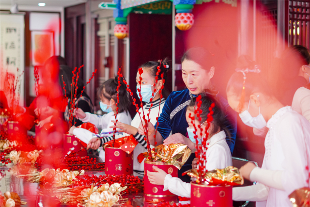 山東省威海市文登區(qū)高村中學(xué)的學(xué)生走進“非物質(zhì)文化遺產(chǎn)——花餑餑文創(chuàng)基地”,在非遺傳承人的指導(dǎo)下了解花餑餑的歷史、學(xué)做虎年花餑餑。