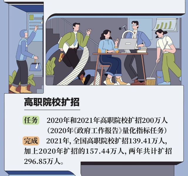 中國教育報-中國教育新聞網北京3月5日訊(記者 梁丹)2021年《政府工作報告》量化指標任務完成情況顯示,2021年,全國高職院校擴招139.41萬人,加上2020年擴招的157.44萬人,兩年共計擴招296.85萬人。