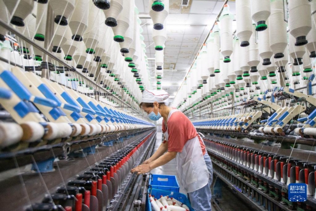 2月28日,工人在江蘇省海安市南莫鎮一家紡織公司生產車間內忙碌。新華社發(翟慧勇 攝)