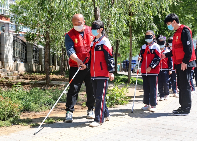 “全國助殘日”來臨之際,5月13日,河北省秦皇島海港區北環路小學開展“換位體驗”活動。助殘志愿者帶領學生體驗殘障人士日常生活,并在體驗活動中講解殘障人士生活中的不便,增強學生對殘障人士的理解和尊重,用行動傳遞社會正能量。 曹建雄 攝