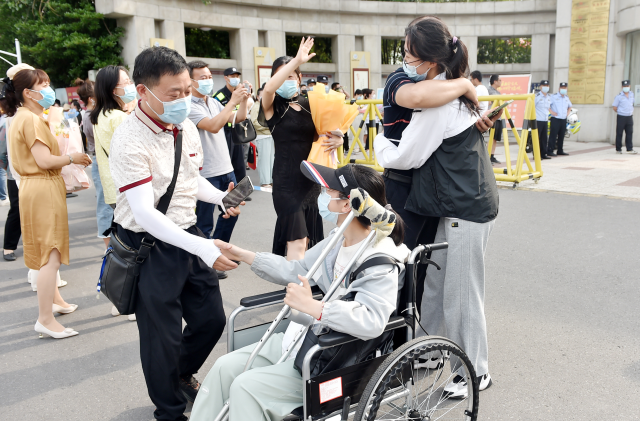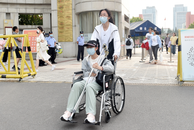 6月9日,江蘇省揚州市邗江中學高考考點大門口,在眾多走出考場的考生中,有兩位結伴而出、一前一后的考生,前面的女生坐在輪椅上,手持一根拐杖,后面的考生雙手緊握輪椅的扶手,推著輪椅。坐輪椅考生的父親,連續說了幾遍謝謝。兩位考生以實際行動“寫”出了另外一份答卷。莊文斌 攝