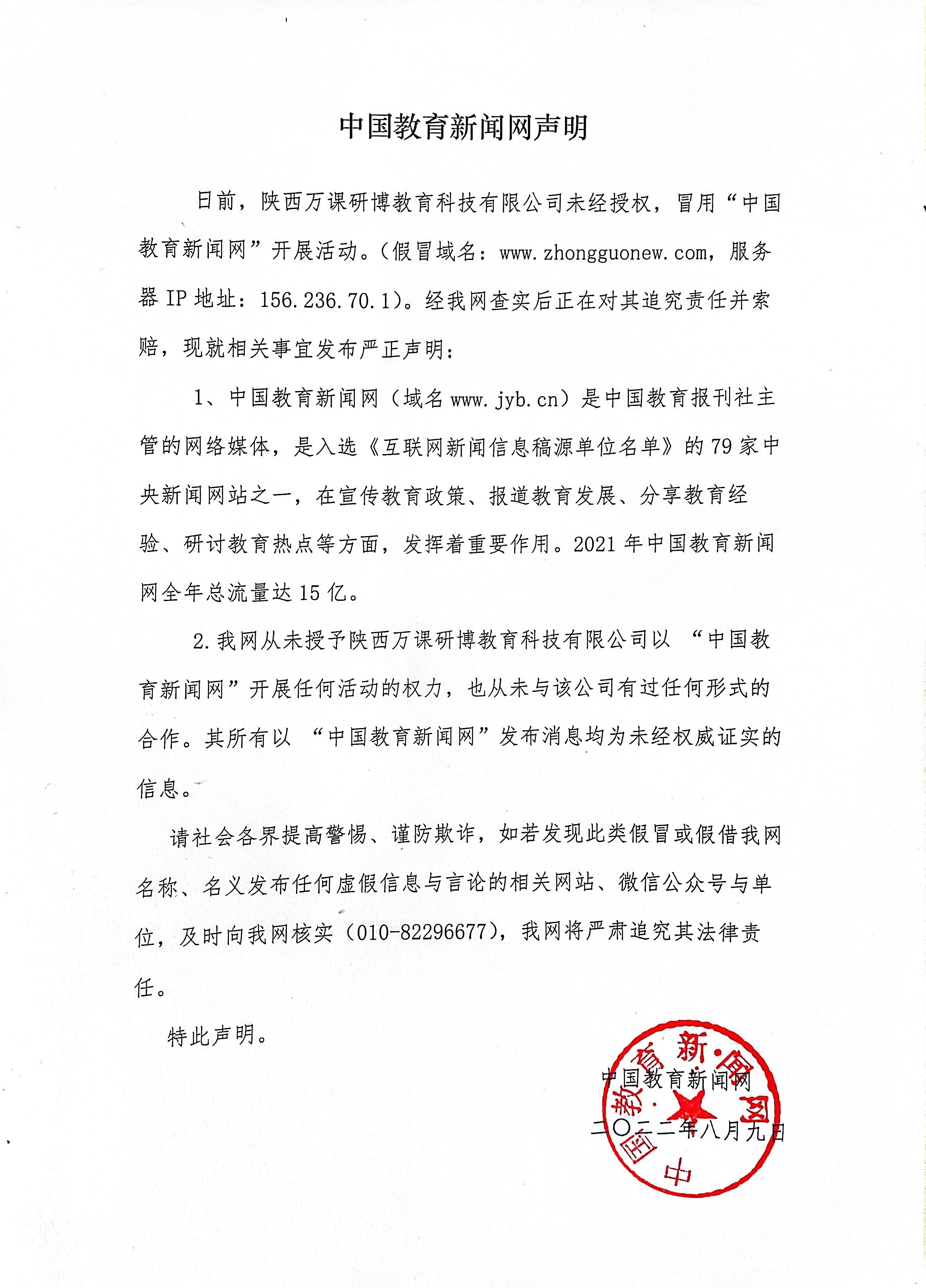 2.我網從未授予陜西萬課研博教育科技有限公司以 “中國教育新聞網”開展任何活動的權力,也從未與該公司有過任何形式的合作。其所有以 “中國教育新聞網”發布消息均為未經權威證實的信息。