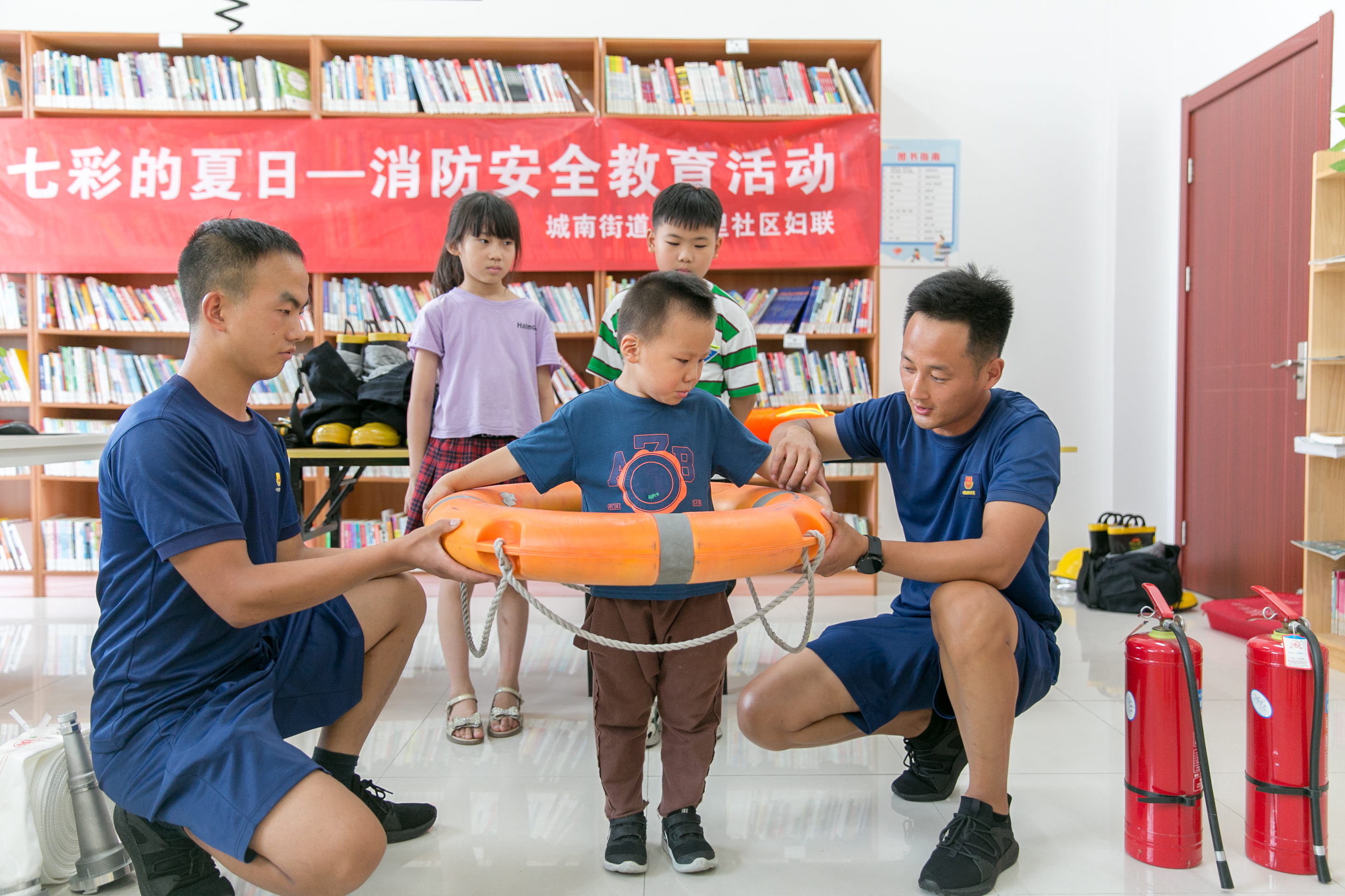8月14日,江蘇省如皋市城南街道新時代文明實踐所、婦聯、高新區消防隊,走進張八里社區農家書屋開展暑期安全教育活動。通過實物演示、游戲等方式為學生講解防溺水、防火防電、急救等安全常識,提高學生的安全意識和自救自護能力,快樂安全度暑假。中國教育報—中國教育新聞網通訊員 徐慧 攝