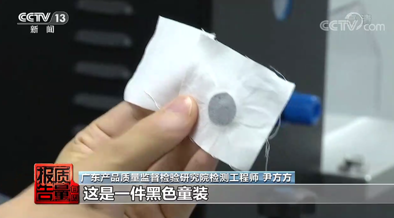 廣東產品質量監督檢驗研究院檢測工程師 尹方方:這是一件黑色童裝,經過摩擦之后的掉色情況,可以發現掉色是十分嚴重的。