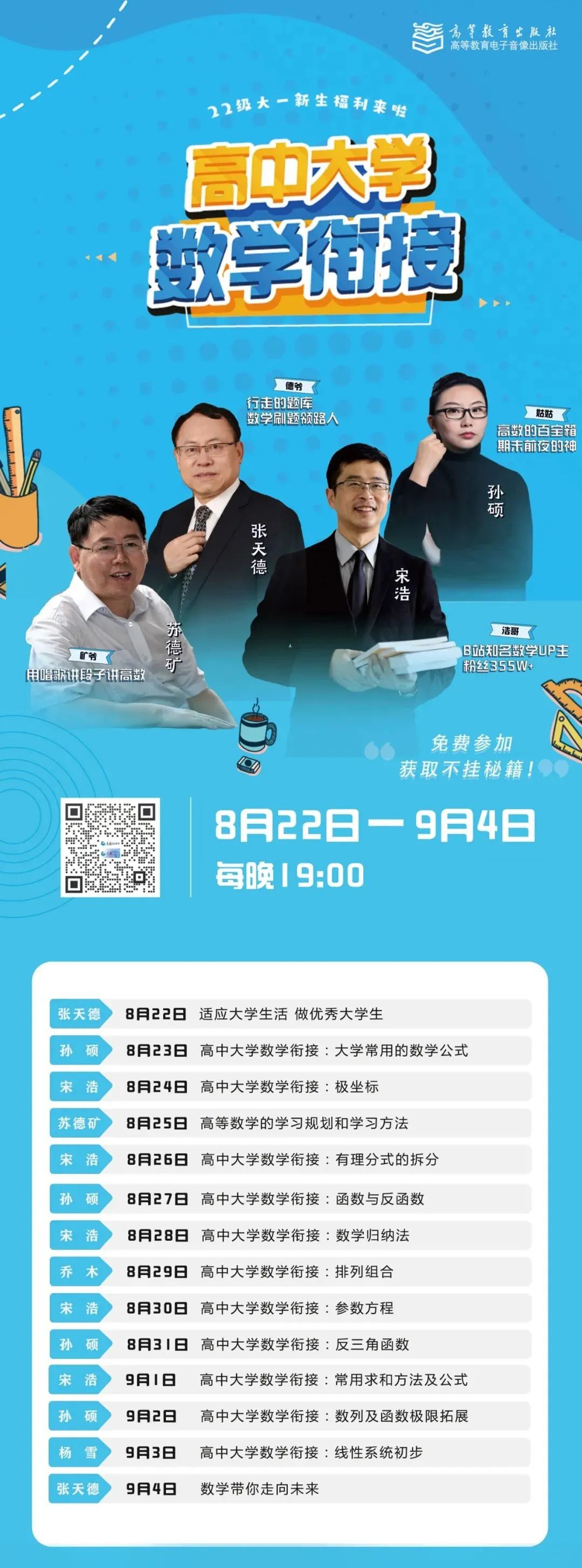 高等教育出版社舉辦的“高中大學數學銜接課”系列公益活動第一期將于8月22日晚7點至8點播出。