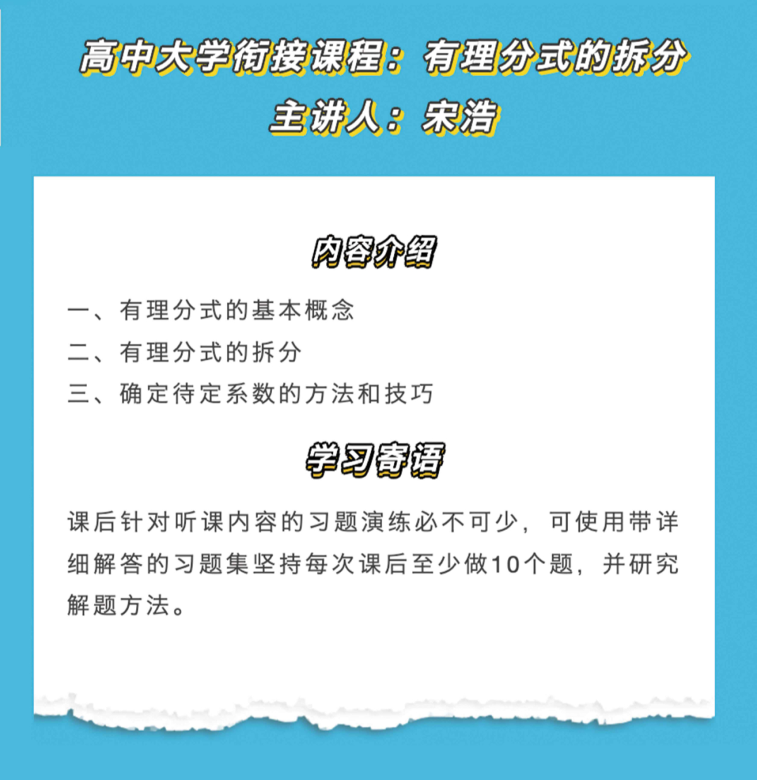 本期主題圍繞“有理分式的拆分”話題展開,擁有全網(wǎng)390萬粉絲,1.5億次高等數(shù)學(xué)視頻播放量的山東財(cái)經(jīng)大學(xué)宋浩老師擔(dān)任主講。主要內(nèi)容包括:有理分式的基本概念、有理分式的拆分、確定待定系數(shù)的方法和技巧等。