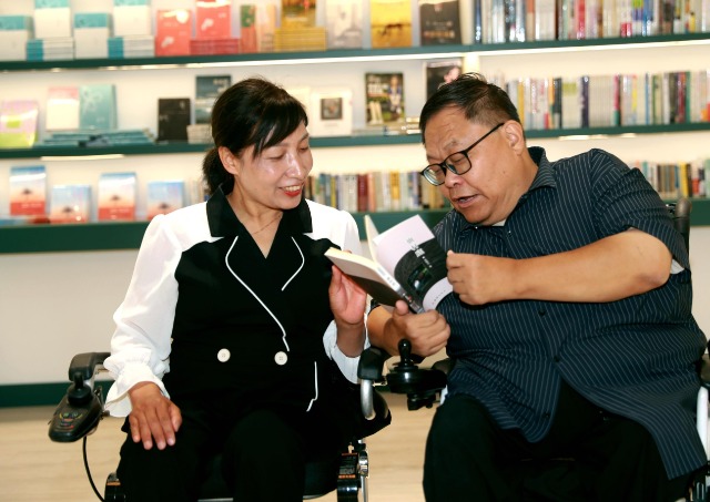 殘疾人作家林曉云(左)和中國殘聯副主席、中國助殘志愿者協會會長呂世明(右)交流。中國殘聯供圖。