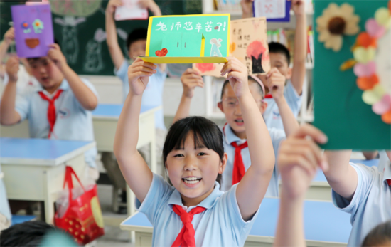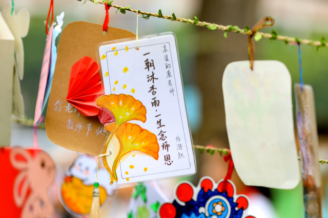學生在校園里懸掛自制的教師節(jié)賀卡。周洪峰 攝