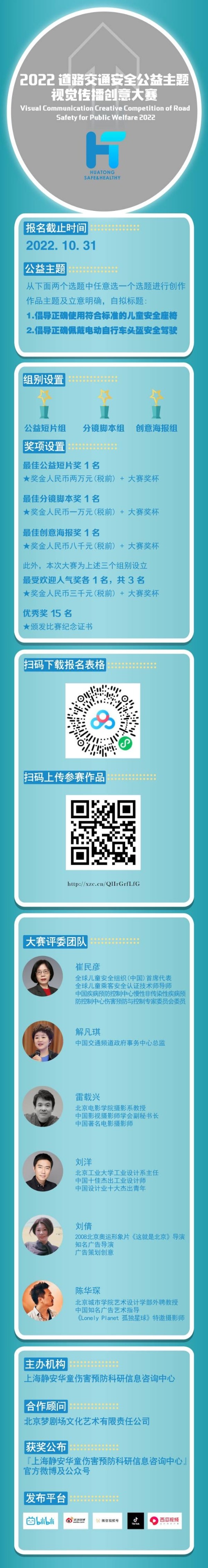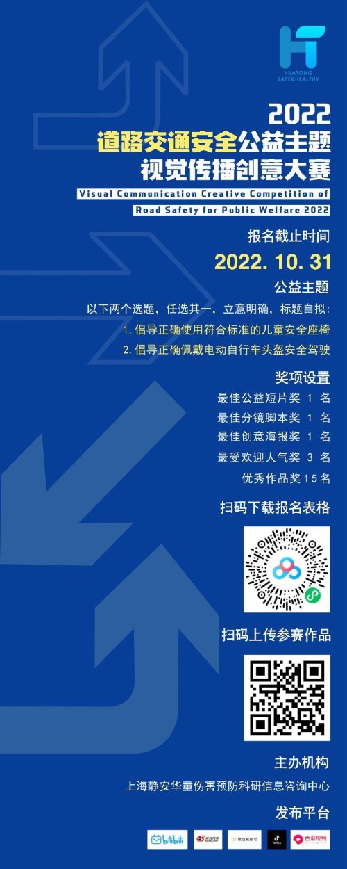 據了解,此次“2022年道路交通安全公益主題視覺傳播創意大賽”是由上海靜安華童傷害預防科研信息咨詢中心發起,目的是提高公眾對于兒童乘車安全、電動自行車駕乘安全的意識,減少道路交通傷害,倡導“一盔一椅”出行,共同營造安全暢通、文明有序的道路交通環境。