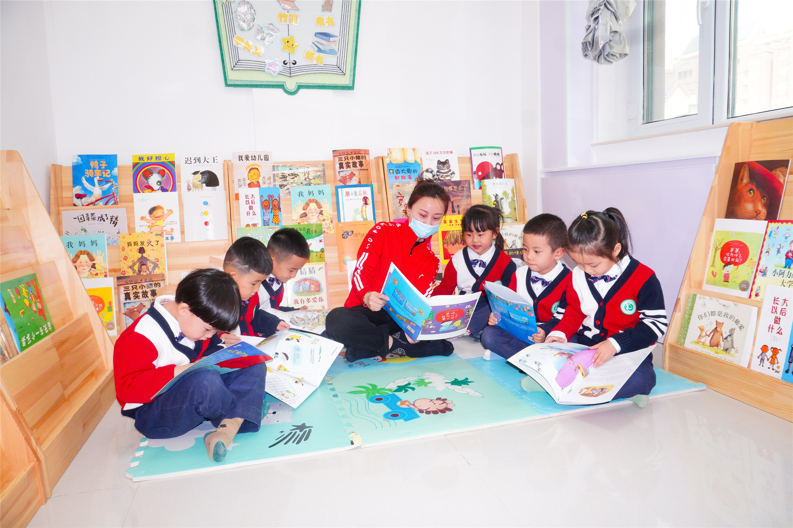 新疆維吾爾自治區昌吉市第十二幼兒園小朋友和老師一起閱讀繪本。楊斌 攝