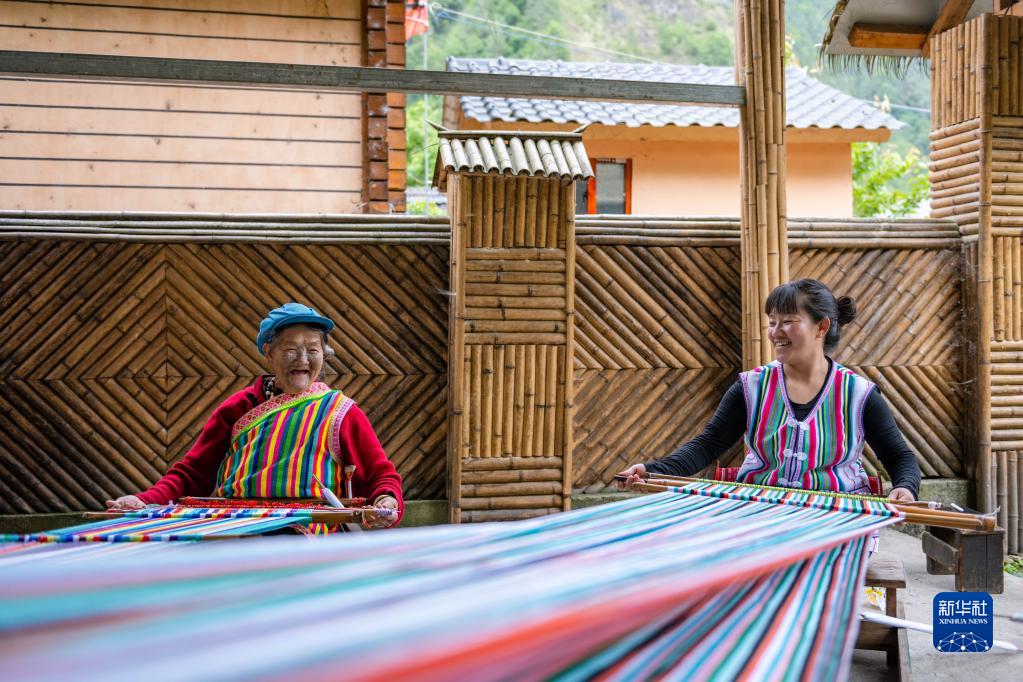 在云南省貢山獨龍族怒族自治縣獨龍江鄉迪政當村,獨龍族老人李文仕(左)和女兒在編織獨龍毯(2022年5月10日攝)。新華社記者 曹夢瑤 攝