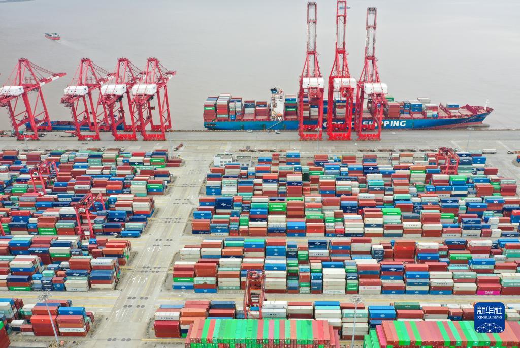 上海洋山港集裝箱碼頭(2022年4月15日攝,無人機照片)。新華社記者 丁汀 攝