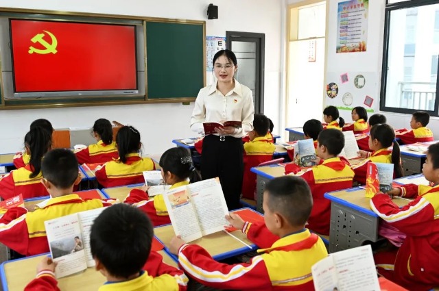 9月23日,湖南省邵陽市洞口縣第二芙蓉學校,黨員教師在向學生講述黨的光輝歷史和紅色故事。滕治中 攝