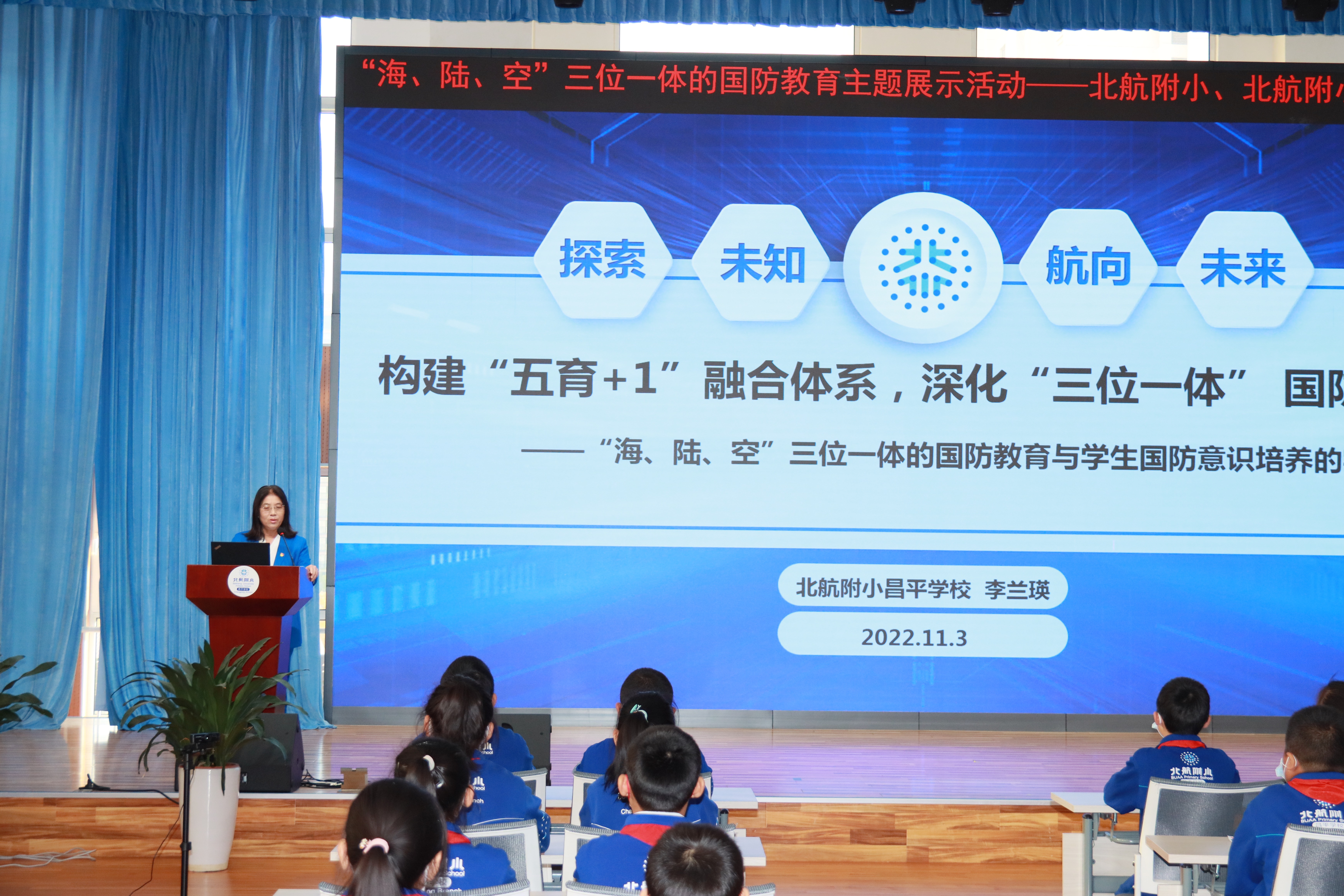 活動中,校長李蘭瑛為參會嘉賓介紹了項目建設的思路和學校的發展變化。學校不斷強化憂患意識、危機意識和使命意識,使熱愛國防、建設國防、保衛國防的萌芽從小培育,同時,繼承北航大學“空天報國”精神,基于“航文化”特色,將“海航、陸航、空航”與學校“航特色”相關內容融入學校內涵發展,以“海、陸、空”為外顯載體,構建了學校國防教育的立體形式。