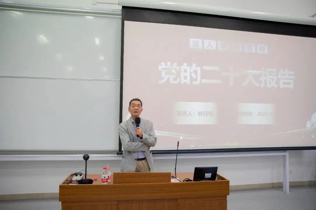 11月8日,廣以副校長、黨總支書記林丹明教授為學生黨員、入黨積極分子、共青團員、入團積極分子召開深入學習貫徹黨的二十大精神宣講會。他希望同學們深刻領會黨和國家對青年一代的殷切期望,肩負起新時代青年的歷史使命,切實把思想和行動統一到黨的二十大精神上來,努力成為堪當民族復興重任的時代新人。