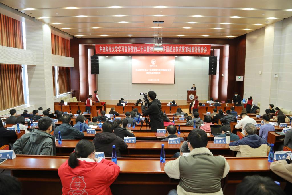 范衛(wèi)宏宣讀了《關(guān)于成立中央財經(jīng)大學(xué)學(xué)習(xí)宣傳黨的二十大精神師生巡講團(tuán)的通知》及巡講團(tuán)名單。學(xué)校學(xué)習(xí)貫徹黨的二十大精神師生巡講團(tuán)由相關(guān)領(lǐng)域?qū)<?、馬克思主義學(xué)院師生、相關(guān)學(xué)院教師、輔導(dǎo)員、退伍士兵、博士生宣講團(tuán)和青馬班學(xué)員等38名代表組成,將圍繞黨的二十大精神開展巡回理論宣講。