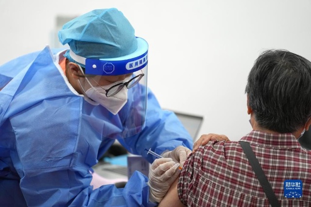 在北京市朝陽區奧運村街道一處新冠疫苗接種點,醫護人員為一市民接種新冠疫苗加強針(2022年7月13日攝)。新華社記者 鞠煥宗 攝
