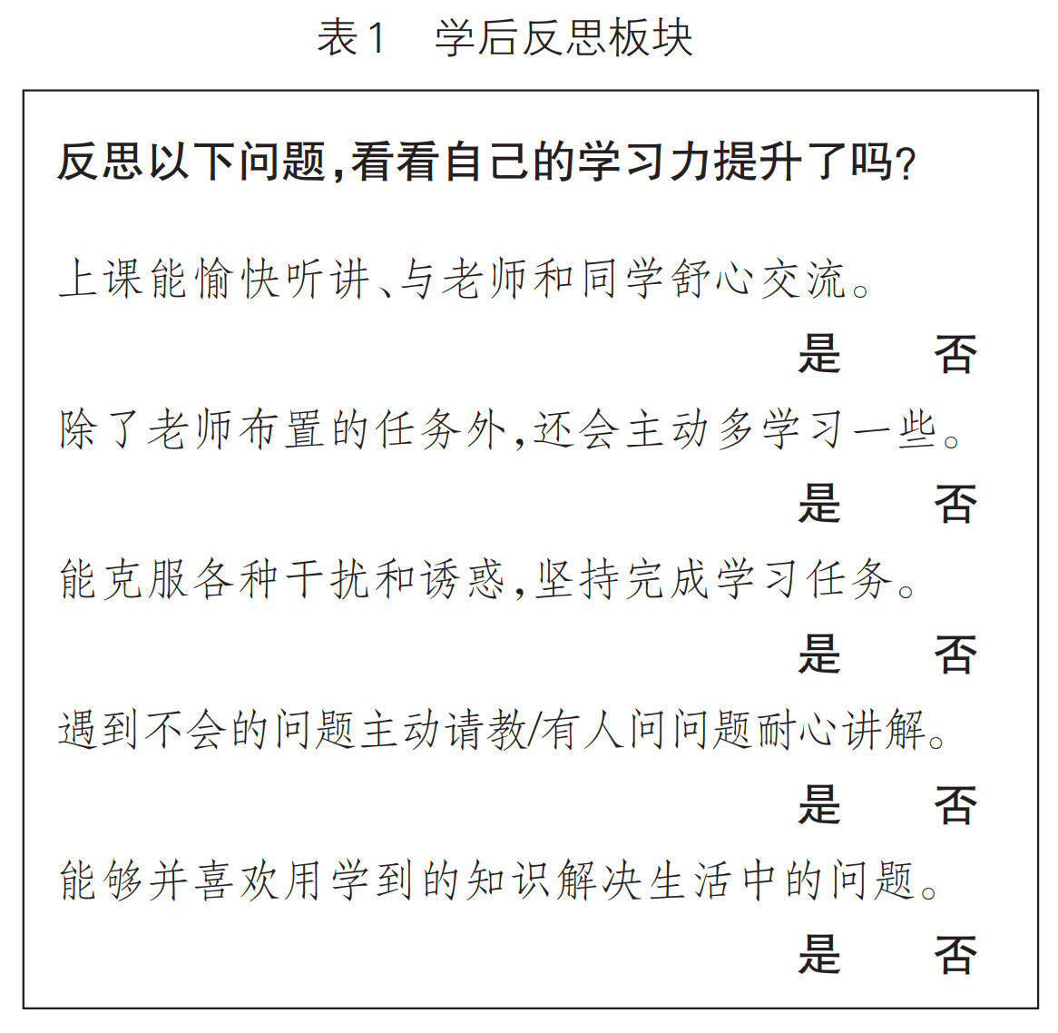 學(xué)校在學(xué)生課堂學(xué)習(xí)任務(wù)單的最后設(shè)計(jì)了學(xué)后反思板塊(見表1),引導(dǎo)學(xué)生每節(jié)課都對(duì)自己的學(xué)習(xí)行為進(jìn)行反思、叩問(wèn),這些問(wèn)題言簡(jiǎn)意賅,條目不多但直指學(xué)習(xí)力核心,不斷引導(dǎo)學(xué)生走向積極學(xué)習(xí)、主動(dòng)學(xué)習(xí)、愉快學(xué)習(xí)。